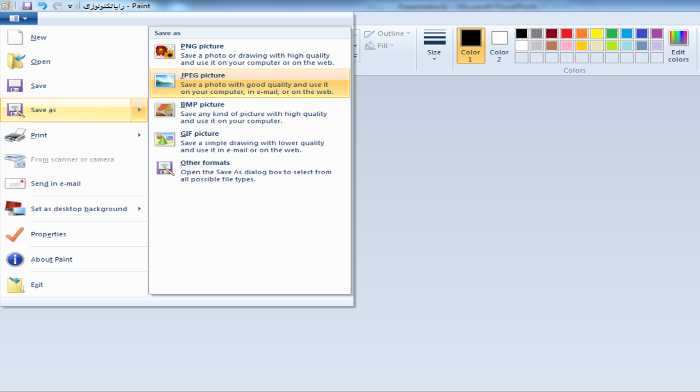 در پنجره باز شده اگر فرمت پیش فرض jpeg بود که هیچ، اگر نبود این فرمت را انتخاب کنید، چرا؟ چون این فرمت فشرده ترین فرمت عکس است (برای مناظر طبیعی) که کیفیت را هم حفظ میکند . این قسمت در هر دو ویندوز xp و 7 مشابه هستند.